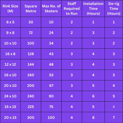 The rinks come in 1m square panels, and can be built in many sizes and shapes – we just need to know how many skaters you would like on your rink at a time.